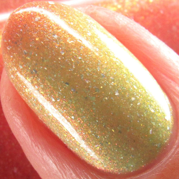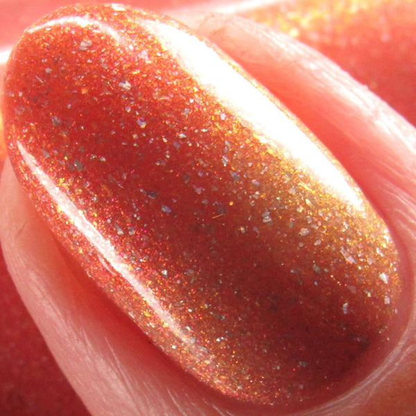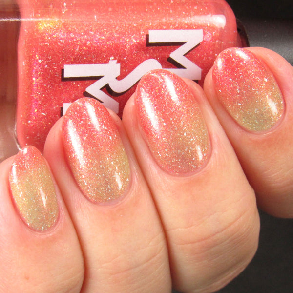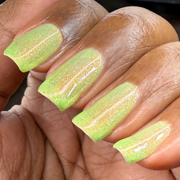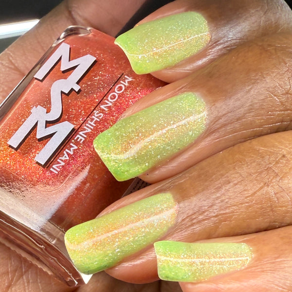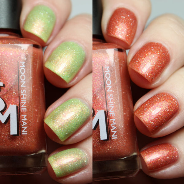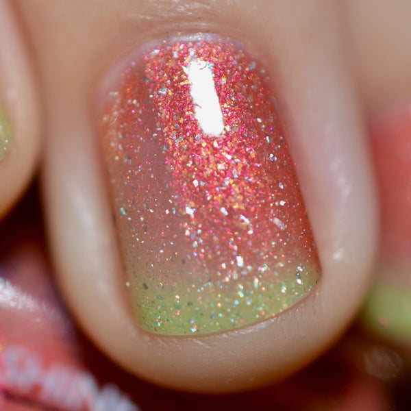 Ho Ho Ho is a cinnamon red to green heat-reactive thermal glowing with pink/red/gold iridescent shimmer, gold iridescent glass fleck, and holo flakies.