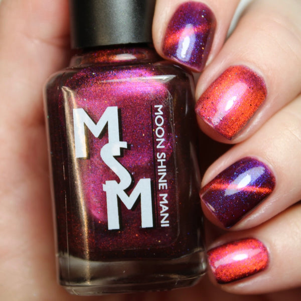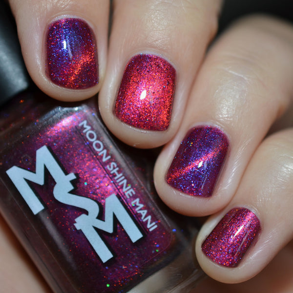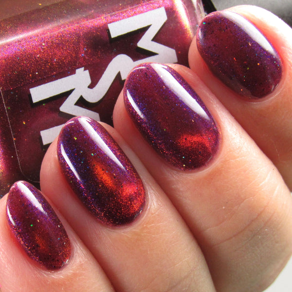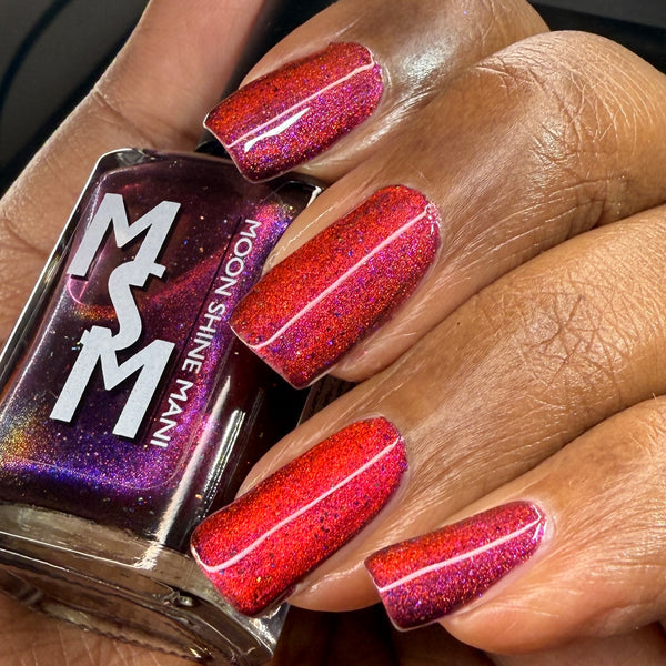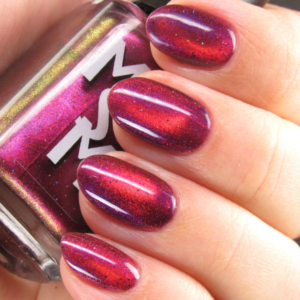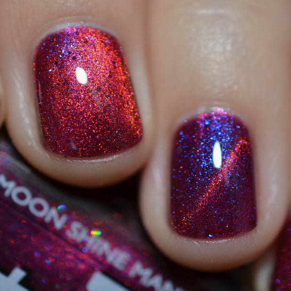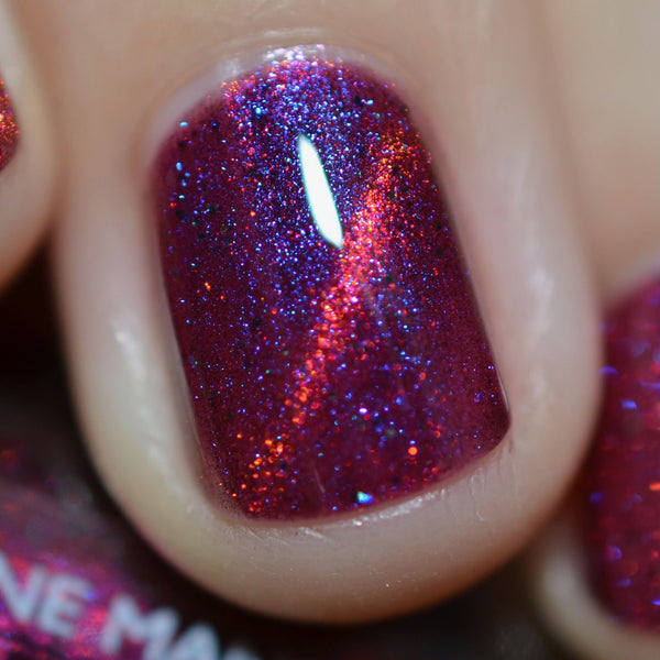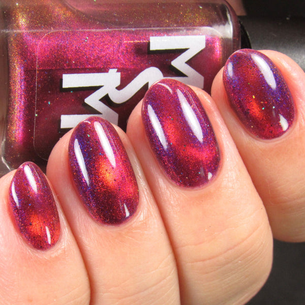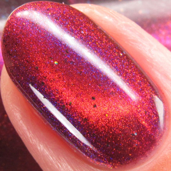 Yipee-Ki-Yay is a deep red jelly glowing with pink/red/gold/green magnetic shimmer, purple/blue iridescent shimmer, and black holo microglitters.