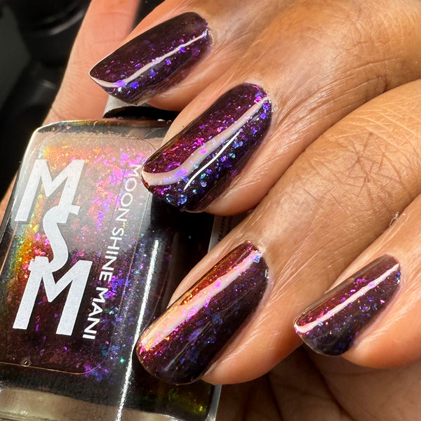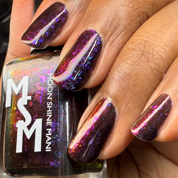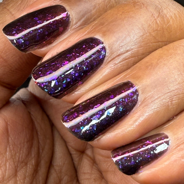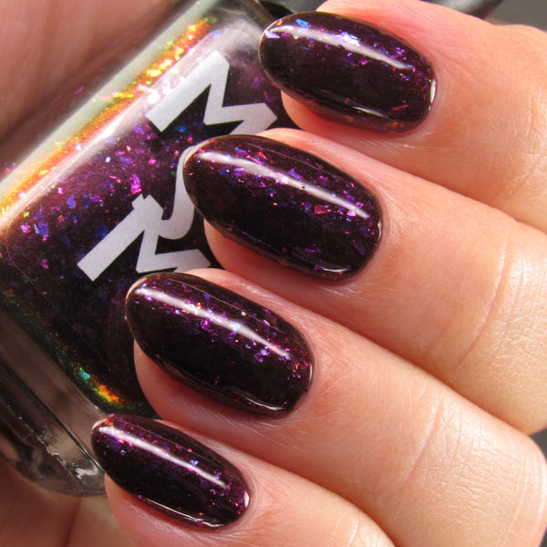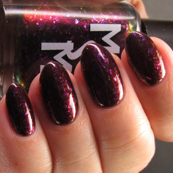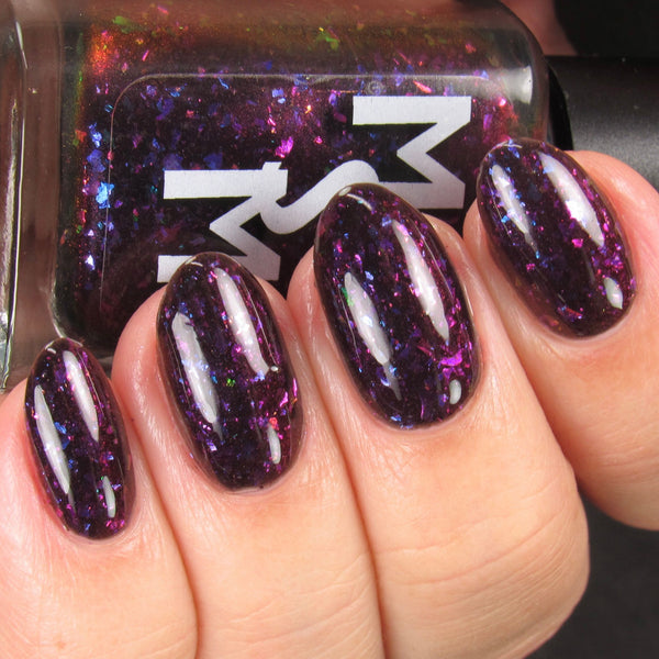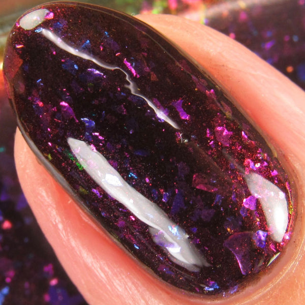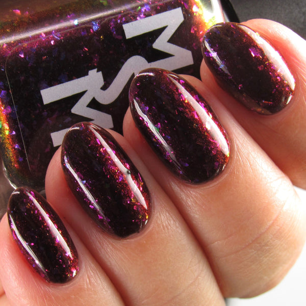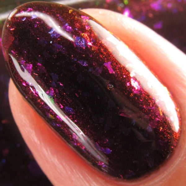 Luna Nyx is a spooky black to red multichrome base speckled with glowy multichrome and iridescent flakes shifting purple/fuchsia/gold/blue.