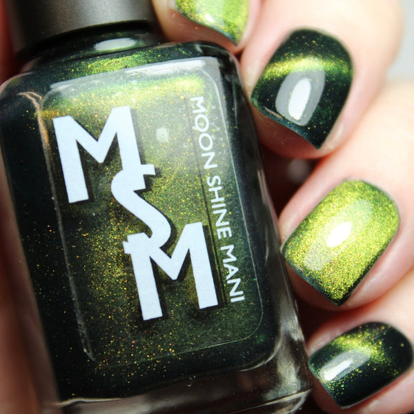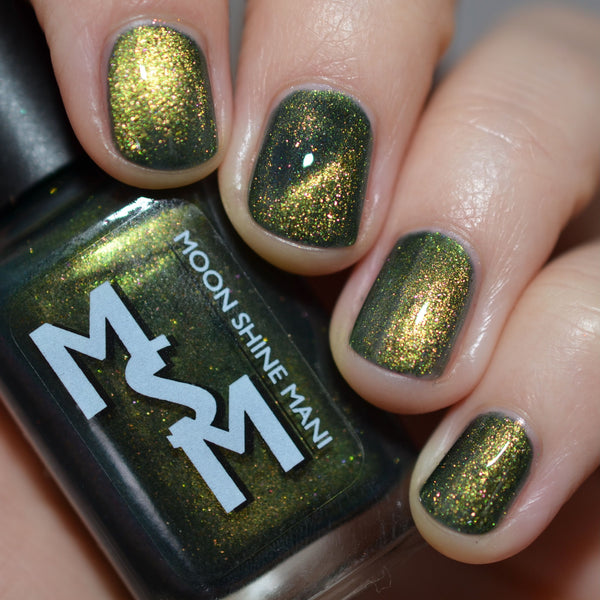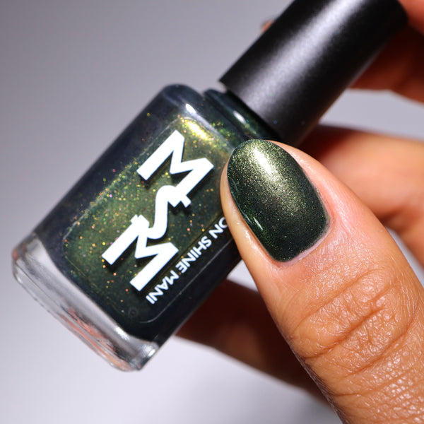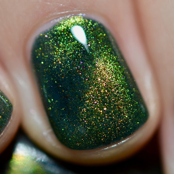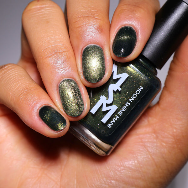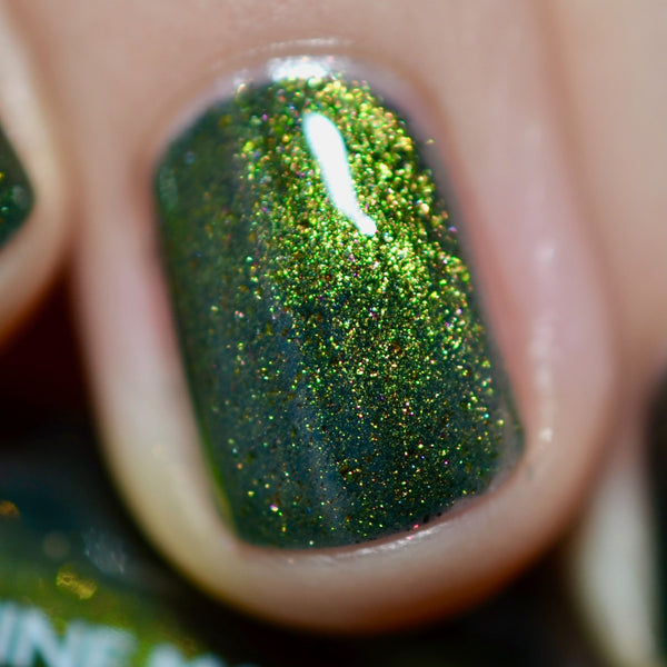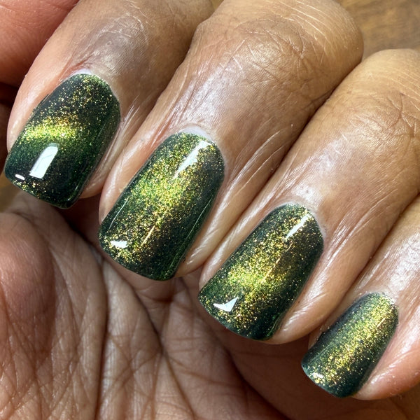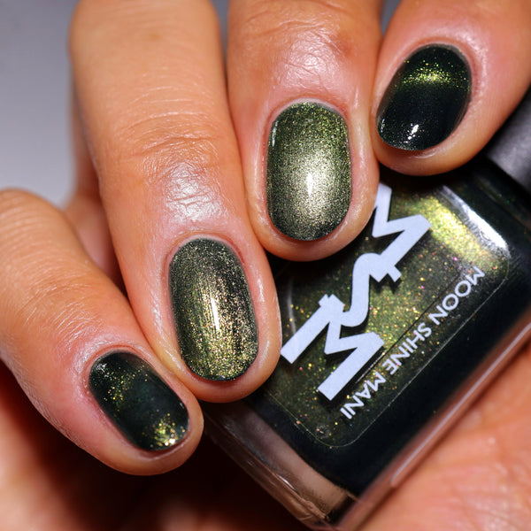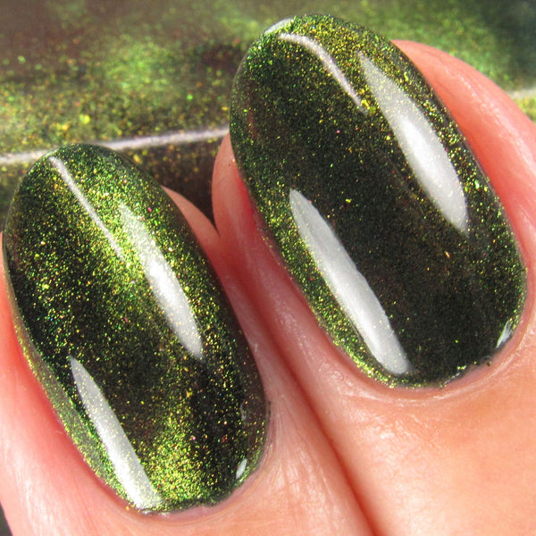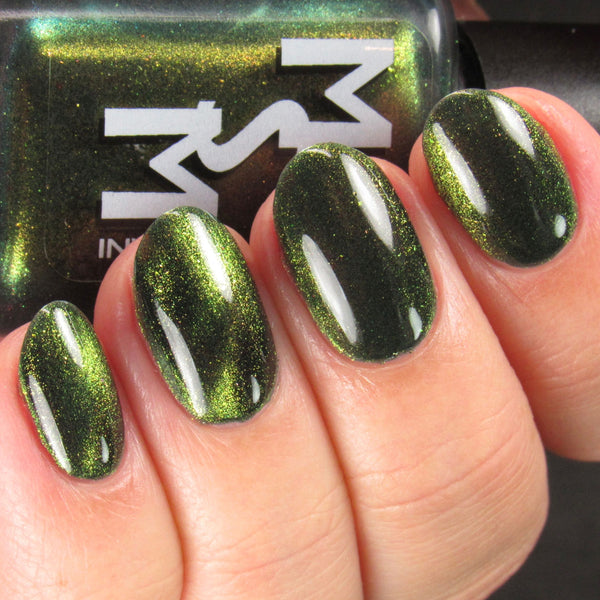 The Matrix is a deep navy glowing with green/lime/gold magnetic shimmer, magnetic flakes shifting green/gold/violet and a soft, underlying black to red multichrome in the base.